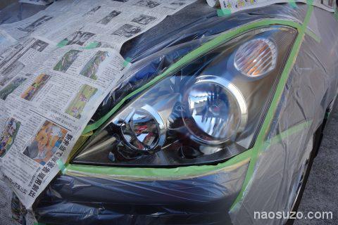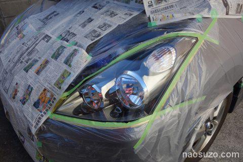 この段階で、マスキング作業を開始します。マスカーテープと新聞紙で車体中央から全部を全部覆う感じで車に余分なウレタンクリアが飛んで大丈夫な様に養生します。