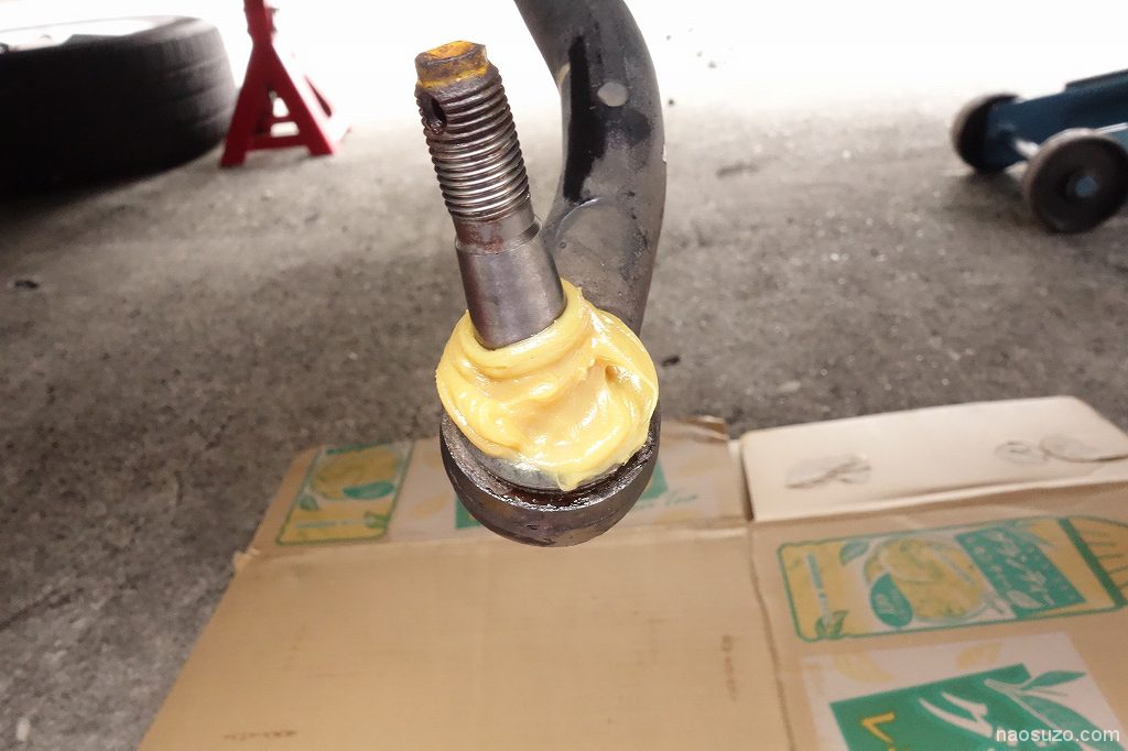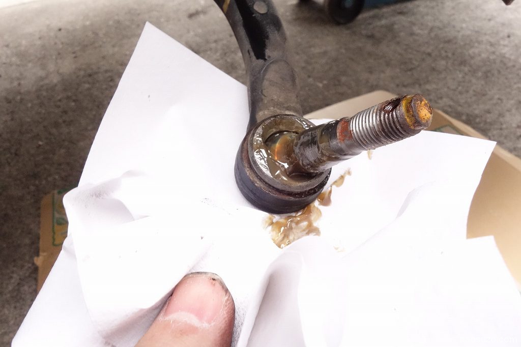 今回、点検の結果、タイロットエンドブーツは破れなし、ロアボールジョイントの方がグリス滲みのみ確認。