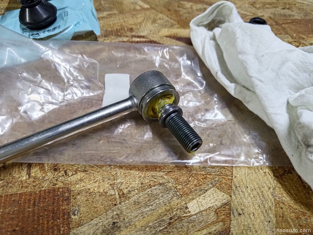 スタビライザーの安物なんですが、どうもゴムブーツがすぐに口パクしちゃうよなんて記事が散見されましたのでメーカ品に交換しておきました。中のグリスもいつもの極圧有機モリブデングリスウレアベースを入れておきます。