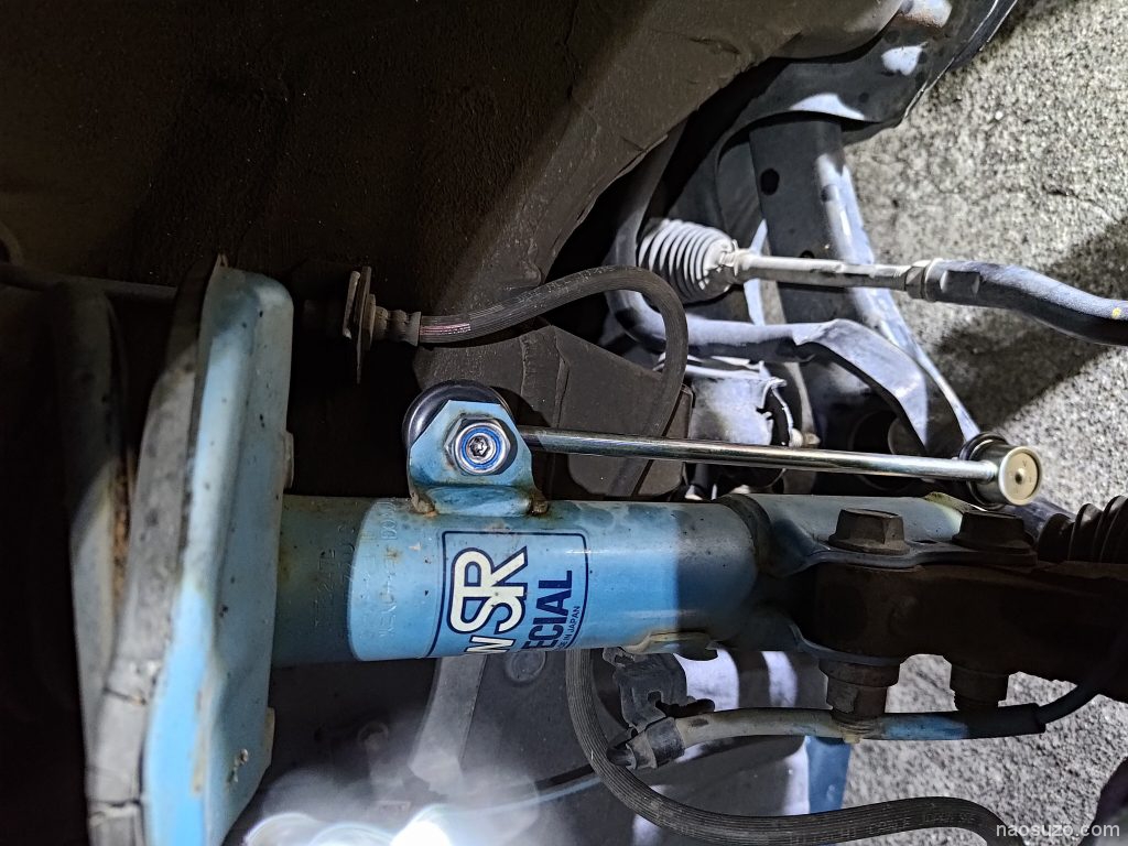 外し方はタイロッドエンドブーツと同じなのですが、プーラーのU字側をゴムブッシュをめくってめり込ませていく感じで奥まで入れないとこの車はそこが狭いのでクラウンナットの真ん中まで入り辛いのが難所かなと思います。