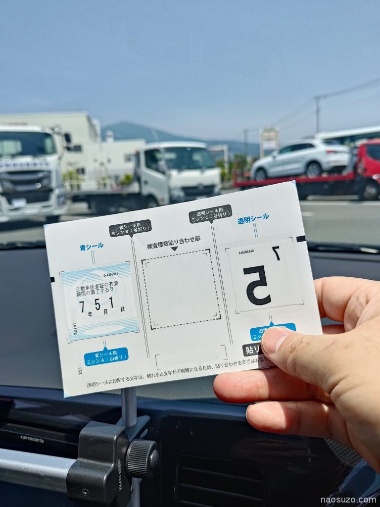 車検シールを貰ってフロンガラスの古いシールを剥がしてから張り替えて完了です。
