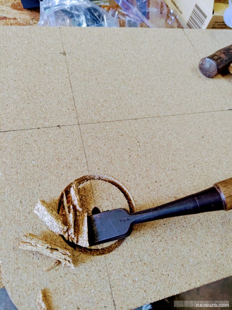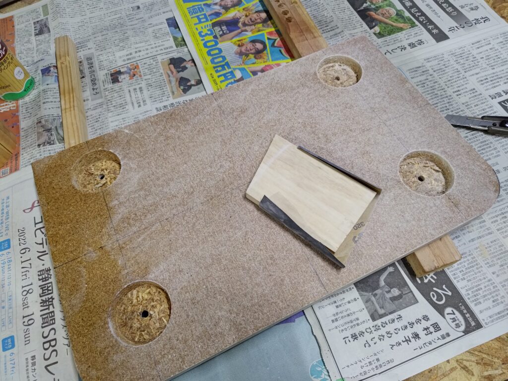 丸のこでカットしてから、ジグソーでやや大きめに角を丸くカットして紙ヤスリなどで形を整えてから車輪を入れる穴を掘ります。この穴は写真がないですが、