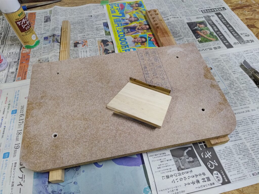 300番くらいの粗めのサンドペーパーで削り取り過ぎないように表面のザラザラを削る感じで磨きます。この作業を3回程度繰り返すとこのMDF合板の独特の手触りの木片の感じがなくなりツルツルになってきます。