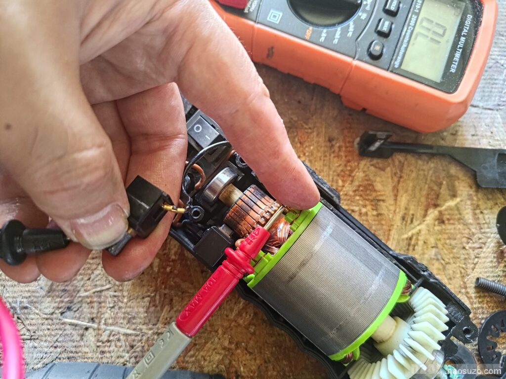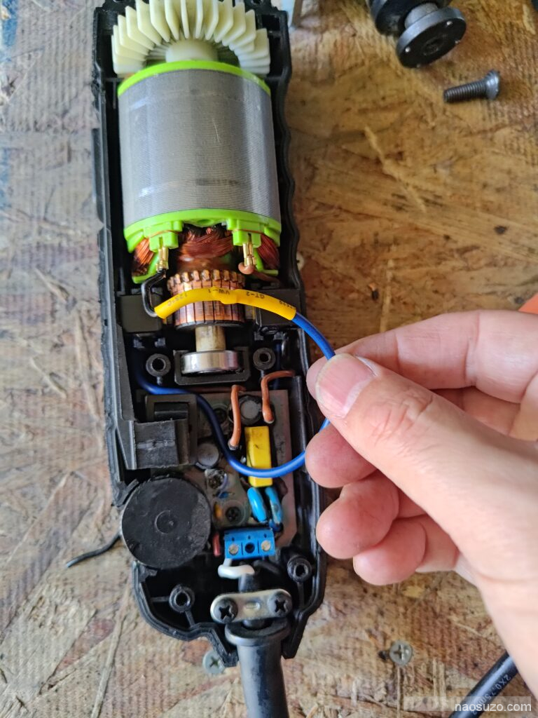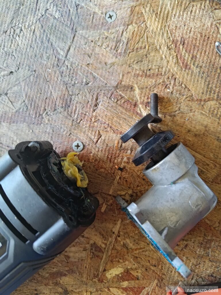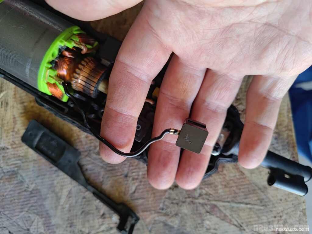 すごいわかりにくいのですが、こっち側のラインがおかしいので良く見たらブラシに繋がる配線が潰れて断線しているようです。工具のデザイン上、狭い部分がありそこらの取り回しの問題でモーターの振動を影響を受けていたようです。