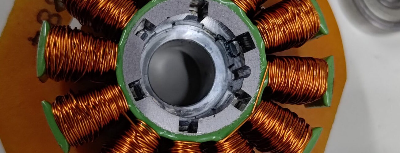 モーターのコイルが見えます。ブラシレスモーターなので、電子回路でこのコイルの通電位置を次次に移動させて回転を行います。