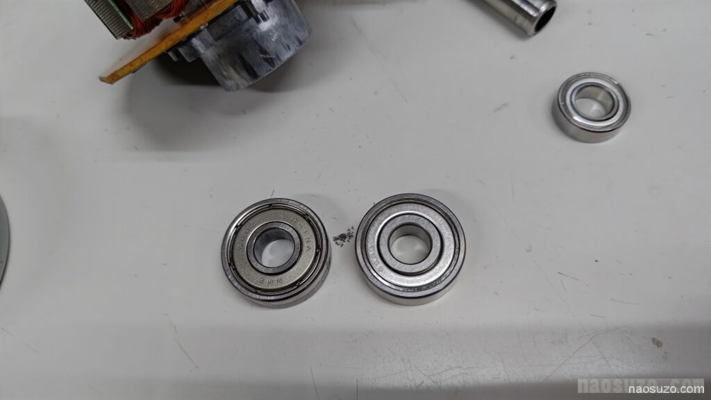 新品と外したベアリングを確認してみましたが、手でクルクル回しても旧ベアリングが特に異常がないように感じましたが、回転物はどっかに傷が入っていたりするだけで調子が変わりますのでなんとも言えず。でも新品はかなり滑らかでNTN製ベアリングなので確かなものです。