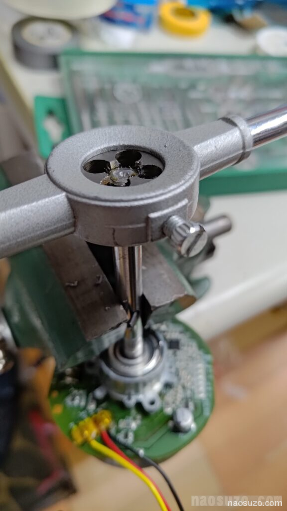 ベアリング交換時に軸を叩いたときに、ネジ山が少し傷んで羽根の固定スクリューが奥までねじ込めなくなったのでネジ山修正します。