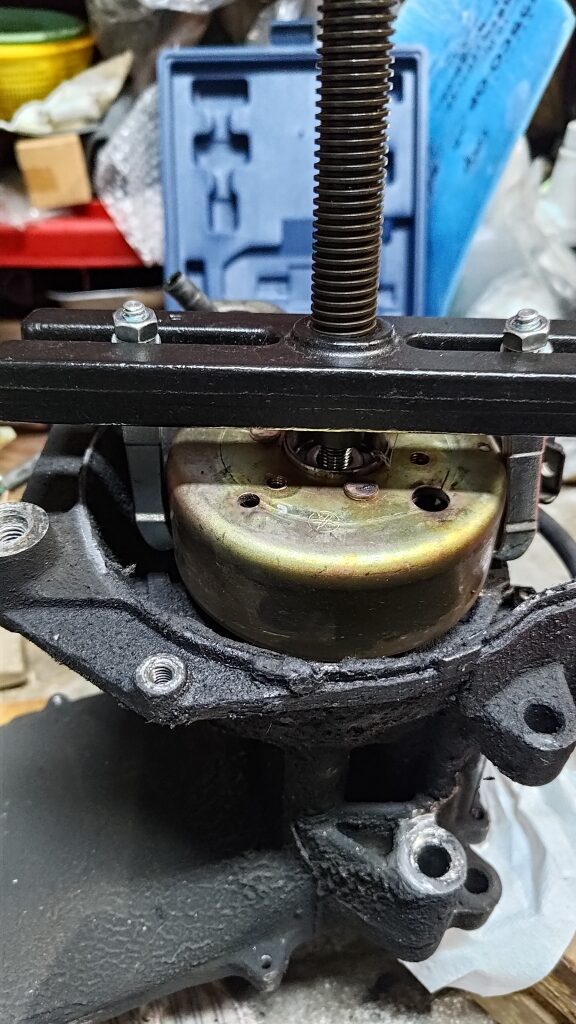 ねじ込むタイプのフライホイールプーラーがないのでアストロで買ってあったギアプーラーに小ベアリングプーラーのカギ手を持ってきて組み合わせて臨時のフライホイールプーラーにしました。
